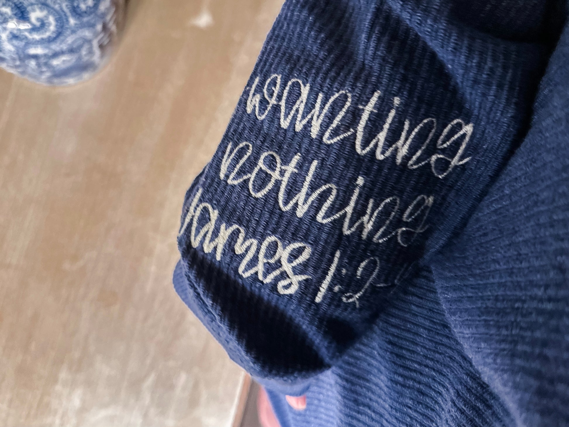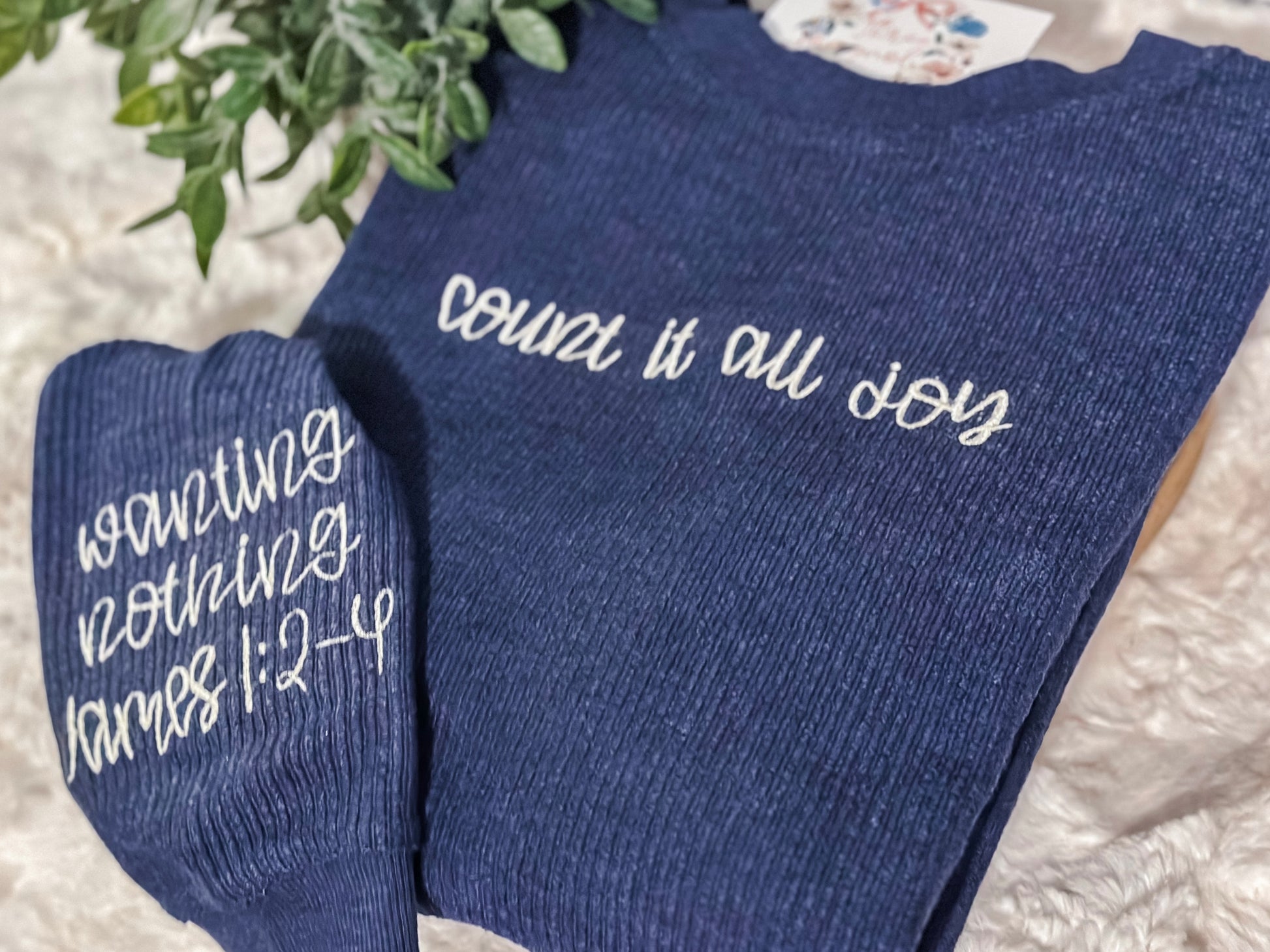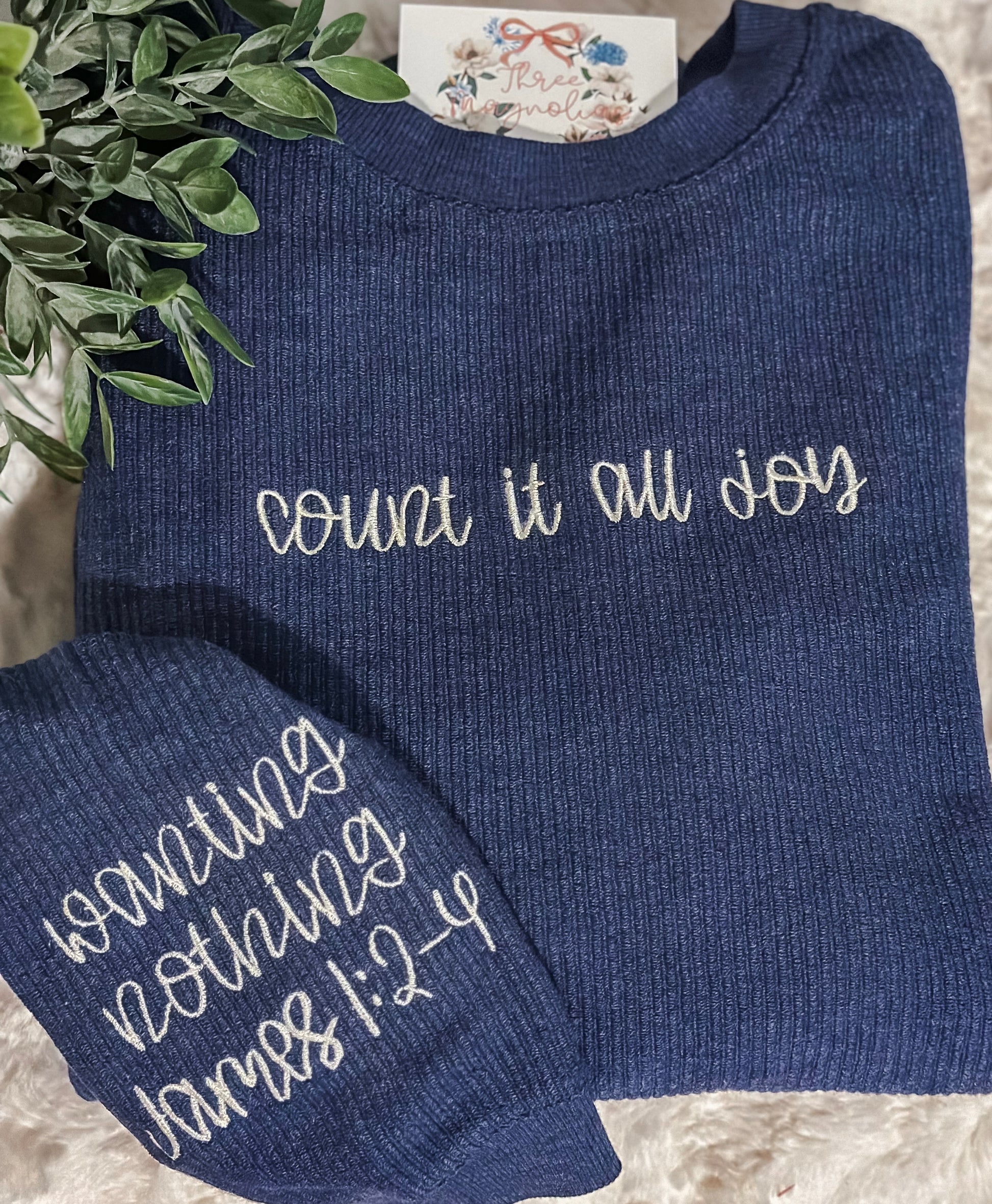 Experience comfort and inspiration with our Count it all joy corded crew. Crafted with a timeless navy and cream color palate, this elevated cozy sHirt features a simple yet powerful message embroidered across the chest and comforting scripture on the sleeve. Stay cozy and uplifted in style.