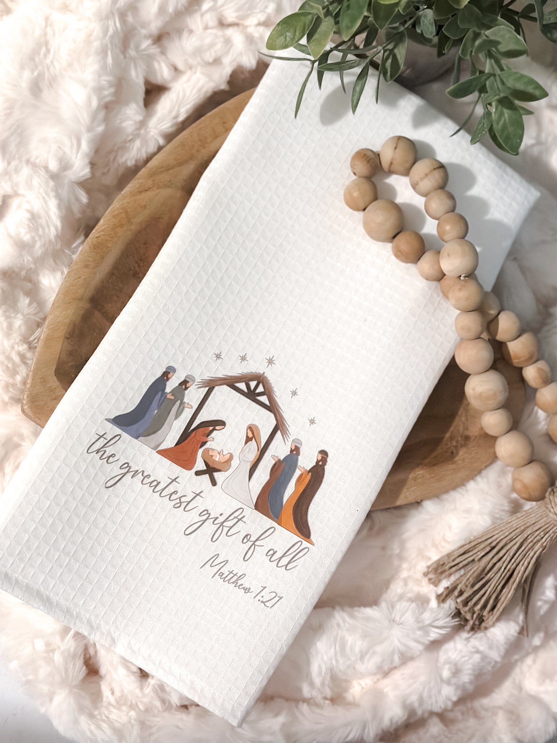 This hand towel features a beautiful nativity scene and the message "The Greatest Gift of All" from Matthew 1:21. Made of 100% polyester with a waffle weave texture, it is easy to care for and perfect for your home or as a thoughtful gift this Christmas.